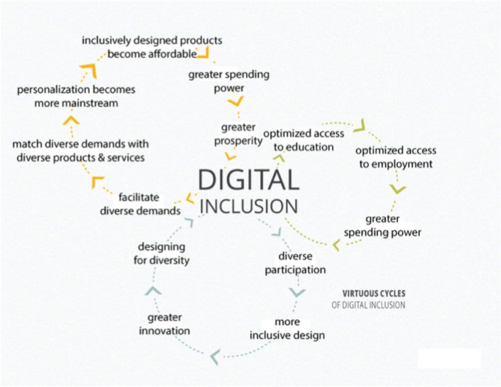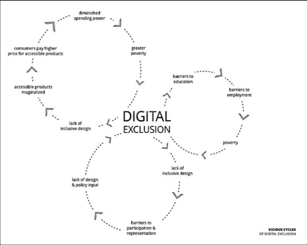 The challenges, or “pain points” that inclusive design seeks to address are often embedded in and feed into vicious cycles. For Cary the student, having a disability (especially a disability that is not “high incidence”) means that he is caught in a vicious cycle of exclusion and impoverishment. Products he needs are not produced by the mainstream market, they have no economy of scale. Hence, when they are available they will cost more, be less readily available, require special skills to operate and maintain, and the likelihood that they will be compatible with the systems everyone else uses are remote. This means that access to education will be harder, this also means that employment possibilities will be more constrained, which will mean that his income is lower while his costs for essential things will be higher. The chances this will change are reduced as it is highly unlikely that he will be at the decision-making tables to advocate for his needs. It is also less likely that anyone like him can be there to represent his needs. This vicious cycle will lead to impoverishment, of opportunity as well as resources, and all the social, physical, emotional and cognitive ills that poverty brings. The vicious cycle Cary is caught in also has an impact on his family, community and society as a whole.